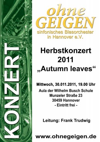 Unter dem Motto „Autumn Leaves“ wollen wir dem Herbst ein wenig Glanz verleihen und unserem Konzertpublikum ein teils beschwingtes und teils stimmungsvolles Programm vorstellen. Seien Sie unser Gast am Mittwoch, 30. November 2011, um 19:00 Uhr in der Wilhelm-Busch-Grundschule, Munzeler Straße 23, 30459 Hannover. Der Eintritt ist frei. [Heike Dingfeld]