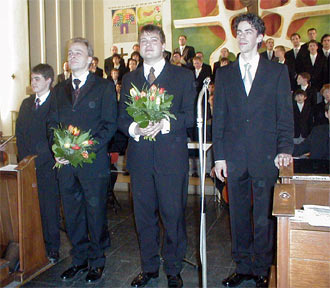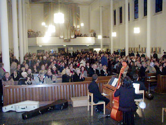 Festkonzert 15 Jahre Musik in St. Augustinus ![]() Winfried Dahn eröffnet das Festkonzert ![]() Blick in die volle St. Augustinuskirche Jörg Breiding und sein Chor begannen mit Heinrich Schütz, dem Meister des frühen Barock, noch mit italienischen Einschlag, ein später Schüler Monteverdis. Von ihm erklang das "Geistliche Konzert" für zwei vierstimmige Chöre und kleiner Instrumentalbesetzung mit Basso continuo "Es ging ein Sämann auszusäen einen Samen". Sehr schön, wie der Chor die vertrackten rhythmischen Passagen mit vollem Stimmvolumen aussang. Jörn Lindemann brachte danach seinen schlanken Tenor gut zur Geltung mit der lateinischen Motette "O misericordissime Jesu", ebenfalls von Heinrich Schütz, begleitet von einem aparten Continuo aus Laute und Cello. Im Mittelpunkt des Konzertes stand Johann Sebastian Bachs selten zu hörende Choralkantate "Aus der Tiefen rufe ich Herr zu dir" (BWV 131) für Chor, Soli (Tenor und Bass) und Orchester, deren schwieriger Satz mit verschränkten Chor und Solilinien klar abgesetzt gut zur Geltung kam. L'ARCO gab dazu ein sicheres musikalisches Fundament. Der Bassist Konstantin Heintel setzte dem, schön ausmoduliert, die Solokantate gleichen Titels von Gottfried Heinrich Stölzel (1690-1749) entgegen. Mit der dynamischen Bachmotette "Fürchte dich nicht" (BWV 228) für zwei vierstimmige Chöre und Basso continuo beschloss der Chor dieses außergewöhnlich interessant zusammengestelltes Konzert. Aber der Knabenchor Hannover kam so ohne weiteres nicht vom Podium. Das begeisterte Publikum verlangte eine Zugabe und bekam sie. Das war noch einmal ein Höhepunkt der Gesangskultur mit dem 100. Psalm (Jauchzet dem Herrn alle Welt) von Heinrich Schütz. Der verlangt zwei vierstimmige Chöre , die Jörg Breiding zur Hälfte im Altarraum, zur Hälfte im Eingangsbereich der Kirche aufstellte. Ein klanglich außerordentlicher Effekt. ![]() Organist, Chorleiter und Solisten erhalten den verdienten Beifall Der Einstand ins 15. Jahr von Musik in St. Augustinus ist gut gelungen. Der Meinung war auch das Publikum und applaudierte heftig. [Kommentieren] |