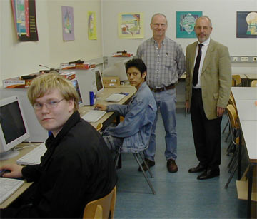 Wolfgang Kargel und Dittmar Huchthausen mit zwei Schülern im Computerraum (v.r.)