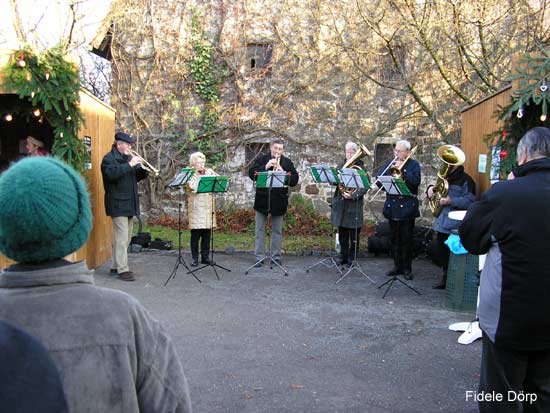Gegen 14.00 Uhr begrüßte Pastorin Marlies Ahlers alle Gäste, die sich auf dem Platz vor der Edelhofkapelle eingefunden hatten. Bevor der Posaunenchor einige weihnachtliche Stücke spielte, dankte Pastorin Ahlers noch den vielen Helfern, die seit dem frühen Morgen die Stände und Buden mit aufgebaut hatten und wünschte sich nun, dass viele Besucher bei ihnen einkehren würden.