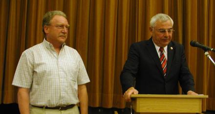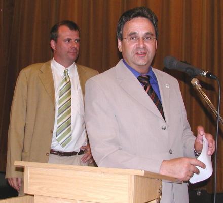 Der Vorsitzende des Fußball-Bezirks-Hannover, Winsmann (rechts) verkündet das Wahlergebnis. Links der neue Vorsitzende des NFV-Kreises Hannover-Stadt, Hans Michael Rabe