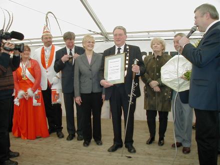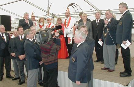 Hans-Karl Leonhardt dankte in einer kurzen Rede für die ihm zuteil werdende Deichgrafen-Ehre: "Liebe Ricklinger Bürgerinnen und Bürger, ich fühle mich sehr geehrt als 12. Ricklinger Deichgraf auserwählt worden zu sein. Ich möchte sagen, ich werde mich bemühen im Sinne meiner Vorgänger für die Sicherheit des Deiches und auch dafür, dass möglichst viele Gelder dafür zur Verfügung gestellt werden, mich einsetzen. Weiterhin möchte ich aber auch sagen, dass ich diese Ehre auch so ansehe, dass ich mit meinen Mitarbeitern in der TSV Saxonia doch auch einen kleinen Beitrag geleistet habe für das Zusammenleben der Bürger in Ricklingen und ich denke es ehrt mich auch sehr, dass wir als Verein, der seinen Ursprung im Stadtteil Linden hat, es mittlerweile geschafft haben, durch hervorragende Nachbarschaft - auch mit dem Verein meines Vorgängers - jetzt dahin zu kommen, dass wir insgesamt uns alle als Ricklinger fühlen. Ich danke Ihnen noch mal recht herzlich für die Ovationen. Und, wie gesagt, ich werde in dem Sinne weiterarbeiten, wie es meine Vorgänger getan haben. Vielen Dank!"