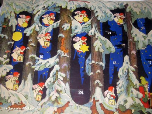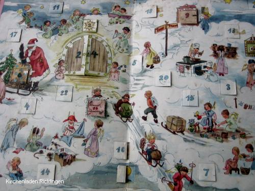 Eine Auswahl gesammelter Adventskalender, ist im Dezember im Kirchenladen zu sehen. Der größte Teil der Ausstellungsstücke gehört zur Sammlung von Frau Gisela Krebs. Die ältesten Kalender sind aus den Jahren 1936 und 1945. Auch ein Nachdruck des ersten „Weihnachtskalenders“ aus dem Jahr 1908, erschienen in der Münchner lithografischen Anstalt Reichold & Lang, gehört zu den Ausstellungsstücken.