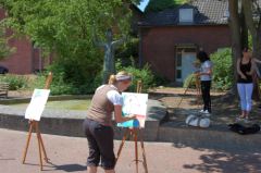 Kurz vor den Sommerferien fand die erste Aktion statt, die vom AK-Butjerbrunnenplatz angeregt und getragen wurde: Jugendliche aus der Kunst-AG der Peter-Ustinov-Schule bauten ihre Staffeleien auf und versuchten, mit Malkreiden der gestellten Aufgabe gerecht zu werden, nämlich die Atmosphäre des Butjerbrunnenplatzes einzufangen.