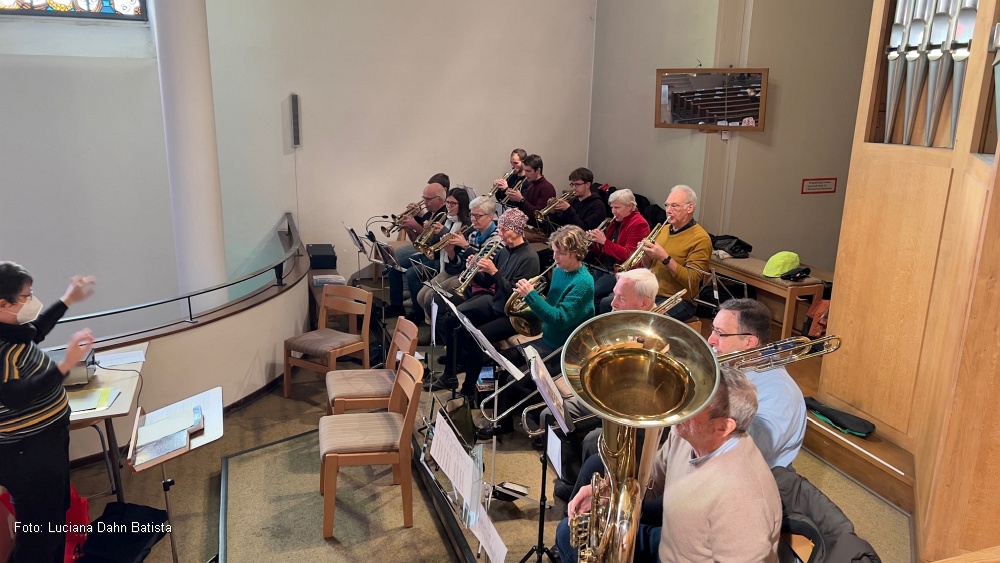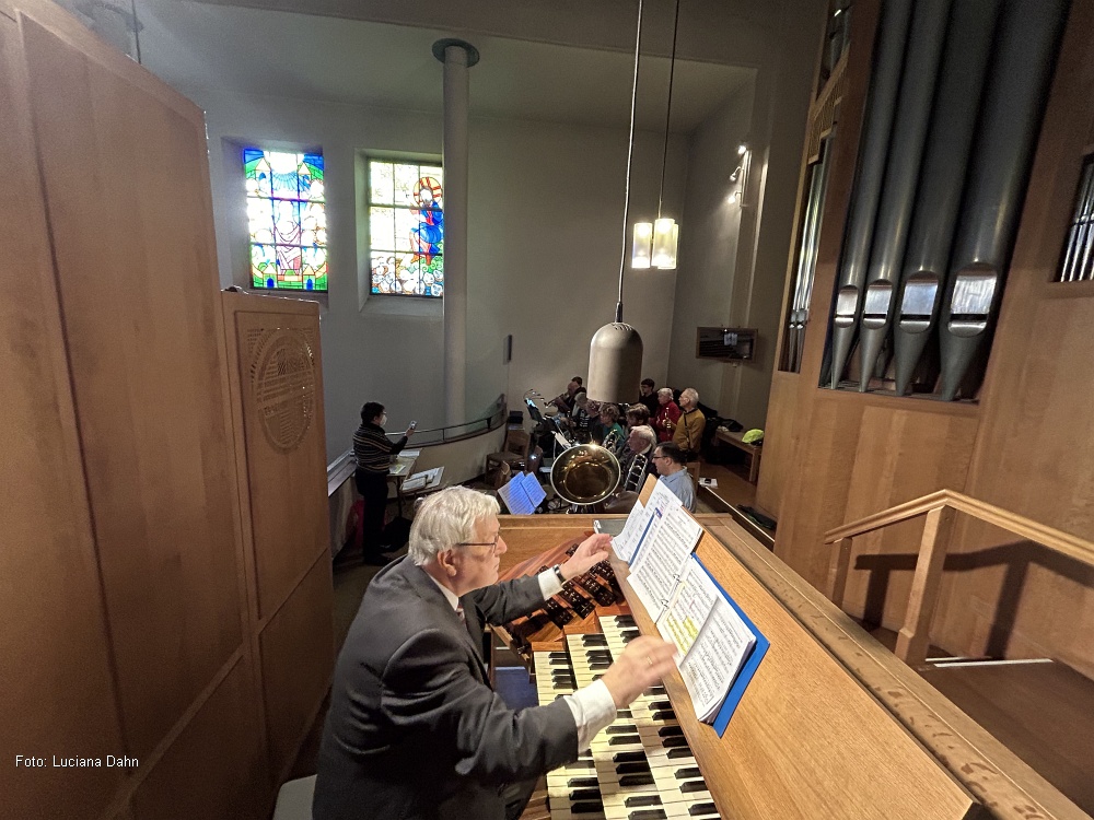 Winfried Dahn an der Lobback-Orgel und der Posaunenchor St. Thomas, Leiterin Ute Salzer