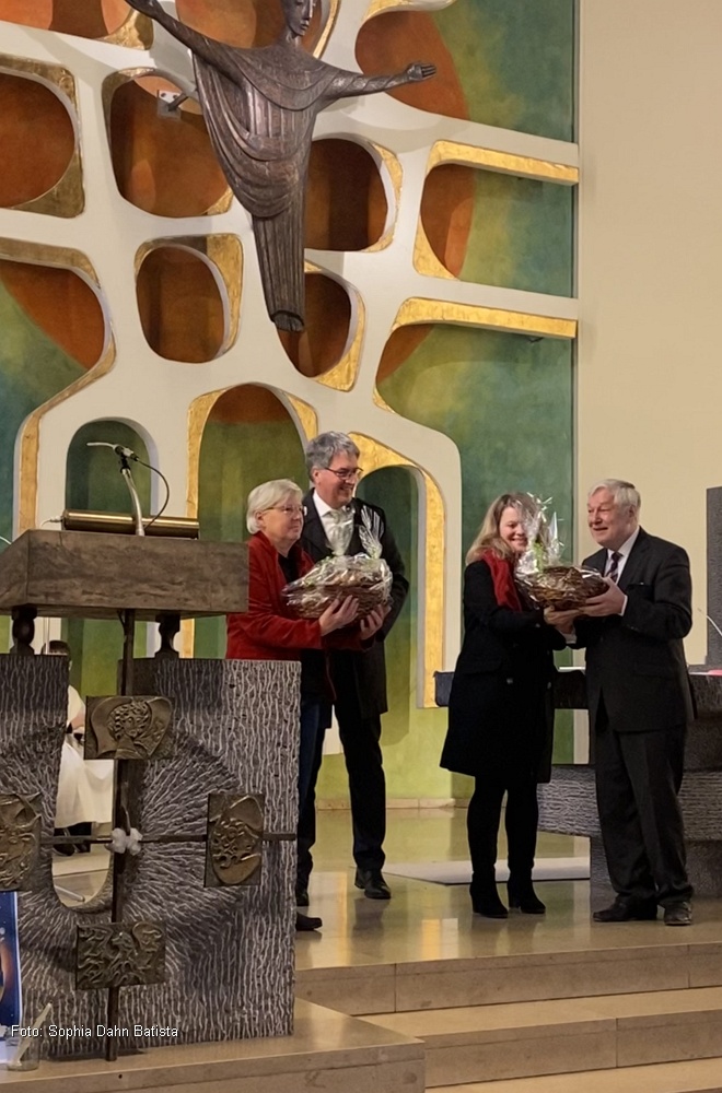 Für die evangelischen Schwestern und Brüder verwies Pastorin i.R. Lampe-Densky in dankbarer, auch persönlicher Erinnerung an die vielfältigen ökumenischen Kontakte zwischen den drei Kirchen, an denen Dahn maßgeblich Anteil habe. „Wenn man mit Menschen spricht, die der Kirche fernstehen, dann gibt es drei Dinge, die diese Menschen wichtig finden als Aufgaben der Kirche. Drei Bereiche kirchlicher Arbeit, die überzeugen. Da ist zunächst die Caritas bzw. die Diakonie.