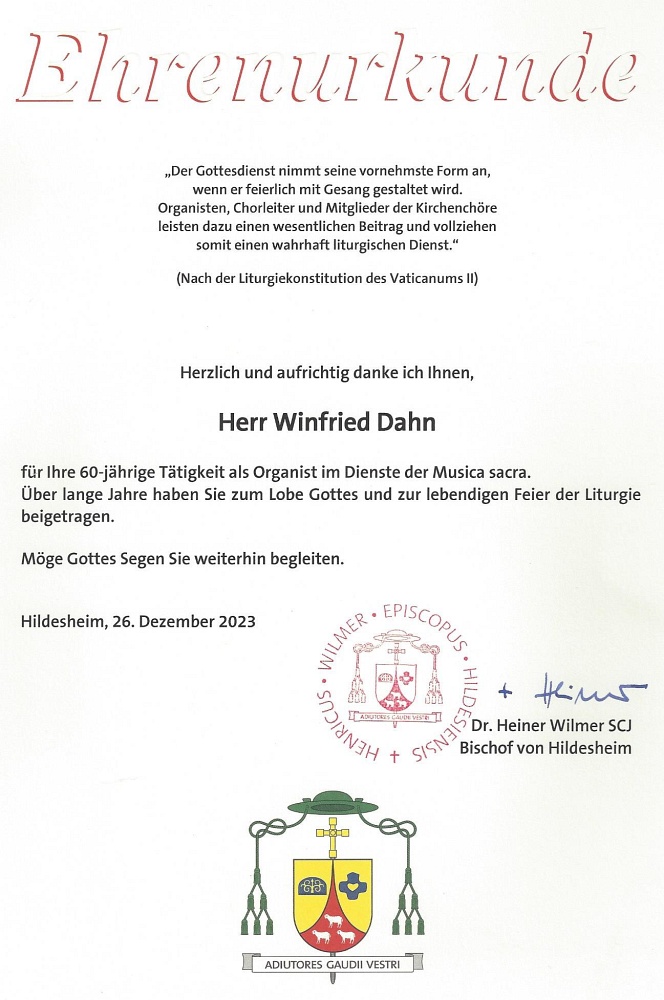 Dafür sind Sie der Gemeinde an der Orgel erhalten geblieben, und wir feiern heute Ihr 60-jähriges Jubiläum im Orgeldienst! Das ist schon ziemlich bemerkenswert, und ich bin persönlich sehr beeindruckt! Im Namen der Landeshauptstadt bedanke ich mich für Ihr Engagement. Sechs Jahrzehnte sind schon ein starkes Zeichen der Verbundenheit! Sie haben auch stets bewiesen, dass Musik Menschen zusammenbringt. Und Musik passt zu uns, denn Hannover ist einfach eine musikalische Stadt!“