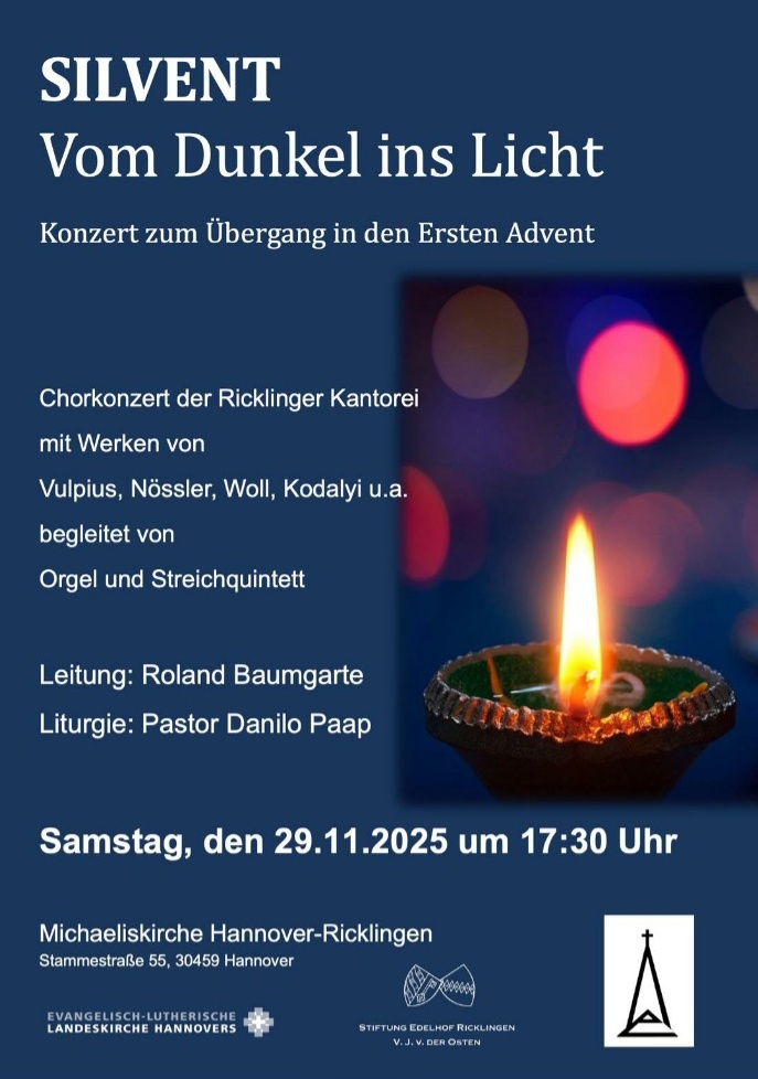 Auch in diesem Jahr wir es am Samstag, dem 29. November in der Michaeliskirche in Ricklingen ein Konzert zum Übergang in den Advent geben. Die Ricklinger Kantorei unter Leitung von Roland Baumgarte wird begleitet von Streichquintett und Orgel. Das Konzert beginnt um 17.30 Uhr mit eher besinnlicher Musik beispielsweise von Pachelbel, Vulpius, Eccard. Um 18 Uhr läuten die Glocken den Advent ein und danach lautet das Motto: "Macht hoch die Tür"! Es erklingen Werke von Bach, Kodalyi und anderen. Die Gemeinde ist gelegentlich zum Mitsingen eingeladen und Pastor Paap wird geistliche Impulse setzen.