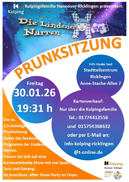 In der Kolpingsfamilie Hannover-Ricklingen wird Karneval seit vielen Jahren mit viel Enthusiasmus und in Zusammenarbeit mit den Lindener Narren gefeiert. Bei der Prunksitzung im Stadtteilzentrum Ricklingen reihen sich Tanzdarbietungen, Comedy-Acts, Showeinlagen und stimmungsvolle Gesangsdarbietungen aneinander. Besonders beliebt bei dem Publikum sind die Tanzgarden und die Tanzmariechen. Eine Kostümierung ist nicht nötig, denn die Kleiderordnung lautet „Business Chic“. Nach der etwa 3,5-stündigen Prunksitzung findet eine After Show Party statt, bei der das Tanzbein geschwungen werden kann. Die zweite Veranstaltung, welche durch Mitglieder der Kolpingsfamilie organisiert wird, ist der kostümierte Gemeindekarneval „Fasching total“. Hier treten lokale Talente aus der Gemeinde und bekannte Gesichter aus der Kolpingsfamilie auf, um das Publikum mit Witzen, Sketchen und musikalischen Einlagen zu unterhalten. Seien Sie dabei, feiern Sie mit uns – wir freuen uns auf Sie! Der Vorverkauf für die Prunksitzung mit den Lindener Narren am Freitag, den 30.01.19:31 Uhr hat bereits begonnen, gern können Sie per Email Karten bei uns bestellen.