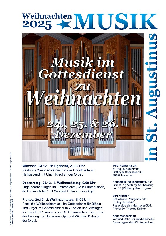 Die Kirchenmusik an der Pfarrkirche St. Augustinus in Ricklingen blickt auf eine lebendige und klangvolle Tradition von über 35 Jahren zurück. In dieser Zeit wurden mehr als 350 musikalische Veranstaltungen in der Kirche gestaltet – Gottesdienste, Konzerte und besondere musikalische Feiern, die weit über die Gemeinde hinaus Menschen im Stadtteil angesprochen haben. Die Weihnachtszeit nimmt dabei seit jeher einen besonderen Platz im kirchenmusikalischen Jahreskreis ein. Mit ihren vertrauten Chorälen, festlichen Orgelklängen und der Mitwirkung von Instrumentalensembles lädt sie zum Innehalten, Mitsingen und Zuhören ein. Auch im Jahr 2025 möchten wir diese Tradition fortsetzen und laden herzlich zu den kirchenmusikalischen Feiern rund um Weihnachten ein. Wir freuen uns darauf, das Weihnachtsfest gemeinsam mit Ihnen mit festlicher Musik zu begehen.
